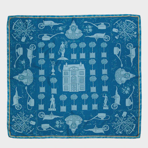 Strewn with garden tools, classical statues and neatly clipped bay trees surrounding a central Manor House this classic silk scarf is an homage to the well dressed female gardeners of the mid twentieth century including Bunny Mellon, Vita Sackville-West and Lady Rhoda Birley.