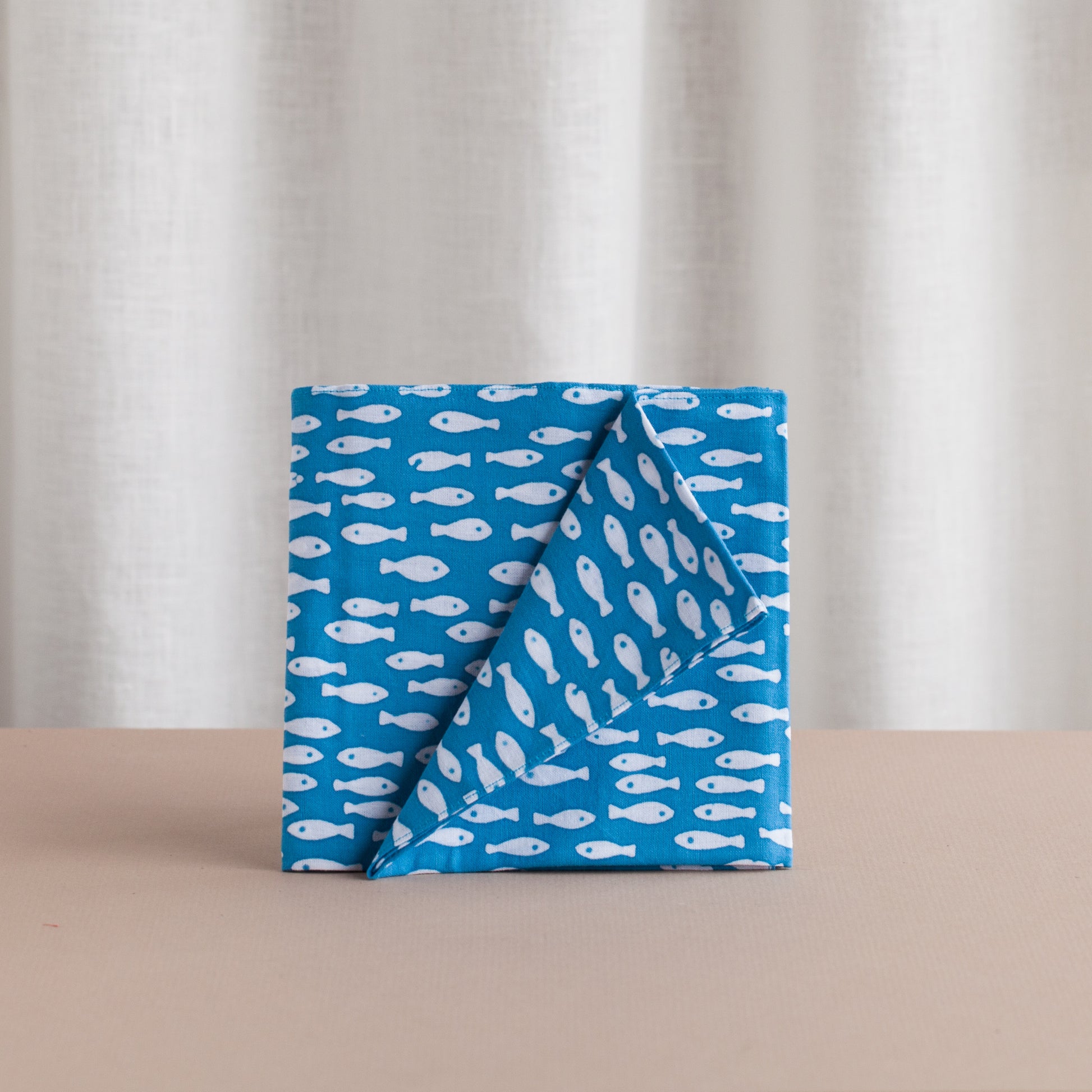- Cotton, light blue with simple white fish.
